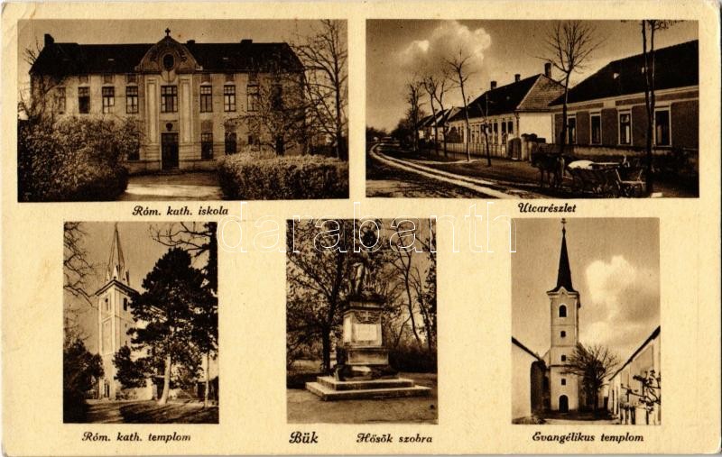1939 Bük, Római katolikus iskola és templom, utca, szekér, Evangélikus... https://www.darabanth.com/de/366-Fernauktion/366.0/Ansichtskarten/Ungarn~1500005/1939-Buk-Romai-katolikus-iskola-es-templom-utca-szeker-Evangelikus-templom-Hosok-szobra-~II2118856