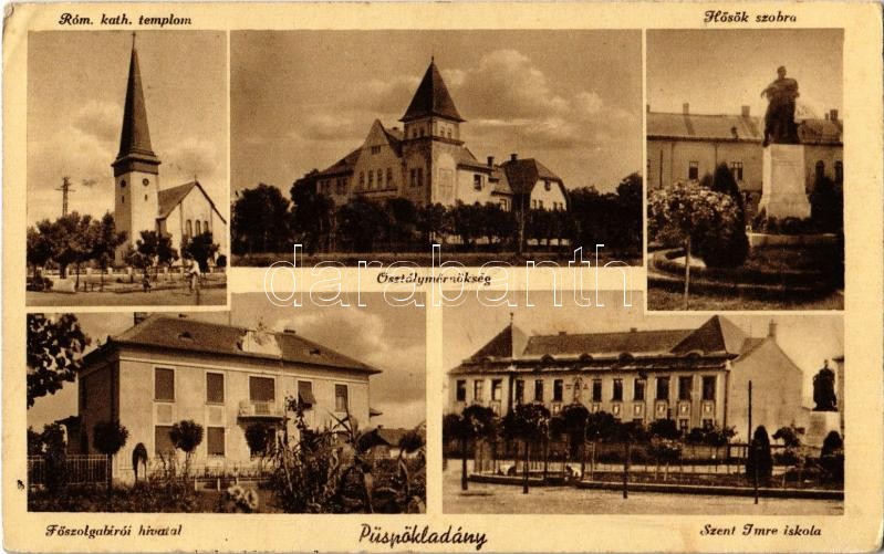 1943 Püspökladány, Római katolikus templom, Főszolgabírói hivatal, Sze... https://www.darabanth.com/de/366-Fernauktion/366.0/Ansichtskarten/Ungarn~1500005/1943-Puspokladany-Romai-katolikus-templom-Foszolgabiroi-hivatal-Szent-Imre-iskola-Hosok~II2118845