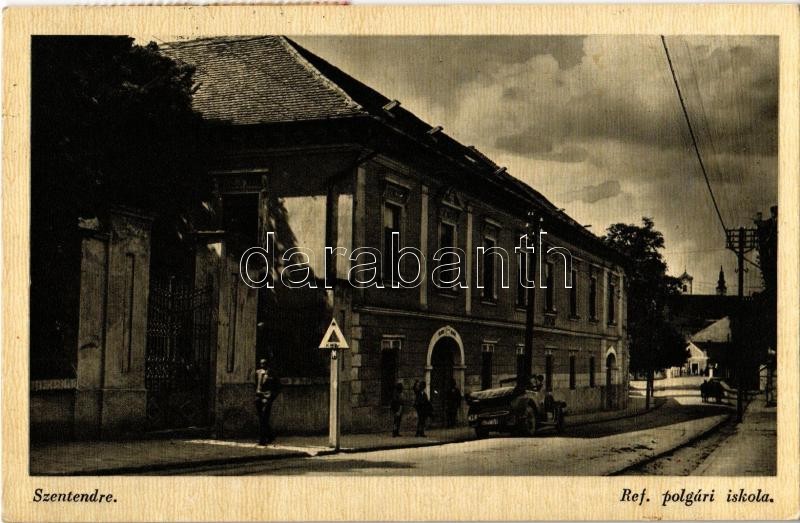 Beschreibung: 1946 Szentendre, Református polgári iskola, automobil. F. Palágyi István kiadása (ázott sarkak / wet corners)