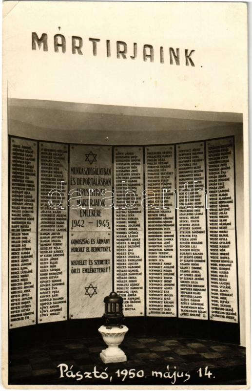1950 Pásztó, Munkaszolgálatban és deportálásban elpusztított mártírjai... https://www.darabanth.com/de/366-Fernauktion/366.0/Ansichtskarten/Ungarn~1500005/1950-Paszto-Munkaszolgalatban-es-deportalasban-elpusztitott-martirjaink-emlekere-Holoka~II2120228