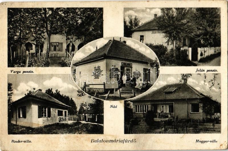 Beschreibung: Balatonmáriafürdő, Varga penzió, Jolán penzió, Binder villa, Magyar villa, Nád Géza üzlete (ázott sarok / wet corner)