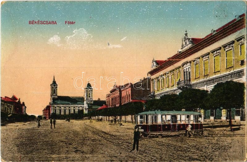 Beschreibung: Békéscsaba, Fő tér, motor, városi vasút, kisvasút, Evangélikus templom, Népbank