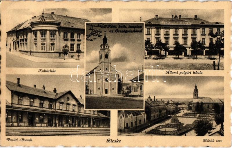 Beschreibung: Bicske, Kultúrház, Római katolikus templom az Országzászlóval, Állami polgári iskola, Vasútállomás, Hősök tere