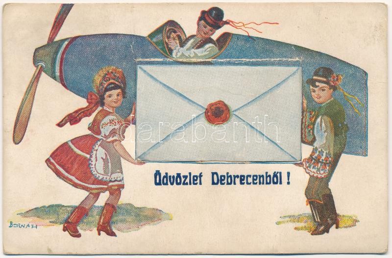 Debrecen, leporellolap repülőgéppel, folklór s: Bernáth (Rb) https://www.darabanth.com/de/366-Fernauktion/366.0/Ansichtskarten/Ungarn~1500005/Debrecen-leporellolap-repulogeppel-folklor-s-Bernath-Rb~II2122297