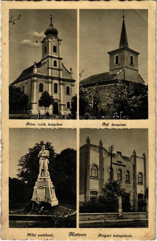 Beschreibung: Hatvan, Római katolikus templom, Református templom, Hősi emlékmű, hősök szobra, Polgári leány iskola (EK)