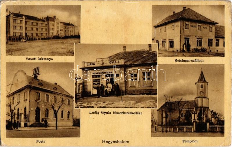 Beschreibung: Hegyeshalom, Vasúti laktanya, Reisinger szálloda és vendéglő, étterem, kerékpár, Posta, Római katolikus templom, Ludig Gyula üzlete és saját kiadása (EK)