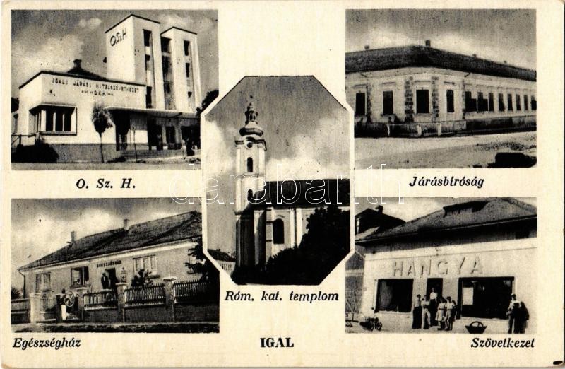 Beschreibung: Igal, Országos Szövetkezeti Hitelintézet (OSZH), Járási Hitelszövetkezet, Járásbíróság, Egészségház, gyógyszertár, Római katolikus templom, Hangya Szövetkezet üzlete (Rb)
