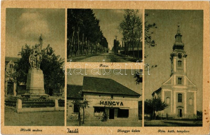 Izsák, Hősök szobra, emlékmű, Fasor, Római katolikus templom, Hangya S... https://www.darabanth.com/de/366-Fernauktion/366.0/Ansichtskarten/Ungarn~1500005/Izsak-Hosok-szobra-emlekmu-Fasor-Romai-katolikus-templom-Hangya-Szovetkezet-uzlete-EK~II2118944