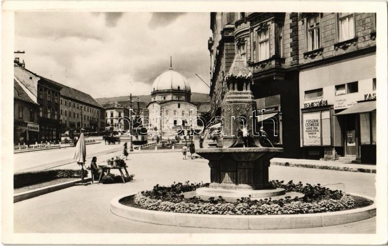 Beschreibung: Pécs, Széchenyi tér, Temesvári K. üzlete, Dermata, villamos, Gázi Kászim pasa dzsámija