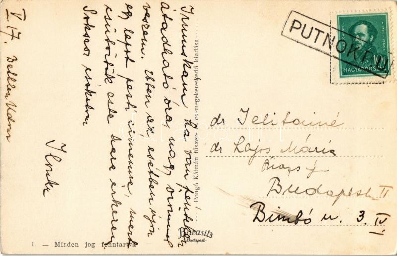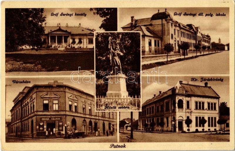 Putnok, Gróf Serényi kastély, Gróf Serényi állami polgári iskola, Kir. Járásbíróság, Városháza, automobil, Hősök szobra, emlékmű, Pongó Kálmán üzlete és saját kiadása + "PUTNOK P.U." pályaudvari bélyegző