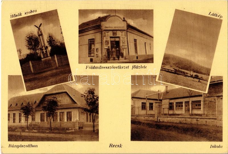 Recsk, Hősök szobra, emlékmű, Földmívesszövetkezet üzlete, Bányászotth... https://www.darabanth.com/de/366-Fernauktion/366.0/Ansichtskarten/Ungarn~1500005/Recsk-Hosok-szobra-emlekmu-Foldmivesszovetkezet-uzlete-Banyaszotthon-Iskola~II2118813