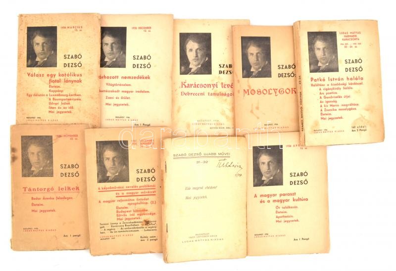 Szabó Dezső füzetek 9 kötete (2., 4-5.,13., 15.16.,23-24., 31-32.,34-35.,43.) Bp., 1934-1938., Ludas Mátyás. Kiadói papírkötésekben, változó állapotban, egy köteten borítóhiánnyal, egy-két borító kissé foltos, egy bortó szélen kis szakadásokkal.