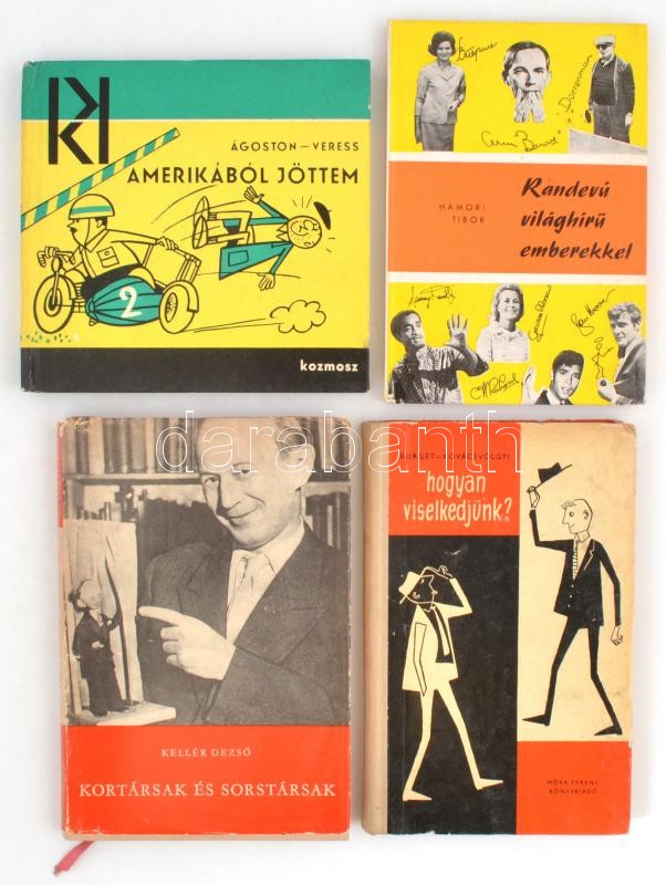 Vegyes könyv tétel, 4 db. Kellér Dezső: Kortársak és sorstársak. Bp., 1971, Szépirodalmi Könyvkiadó. Kiadói egészvászon kötésben, enyhén sérült papír védőborítóval. Ágoston György, Veress István: Amerikából jöttem. Bp., 1965, Kozmosz könyvek. Kartonált kötésben. Hámori Tibor: Randevú világhírű emberekkel. Bp., 1971, Medicina. Kartonált kötésben. Burget Lajos, Kovácsvölgyi Sándor: Hogyan viselkedjünk? Bp., 1962, Móra. Kopott kartonált kötésben.