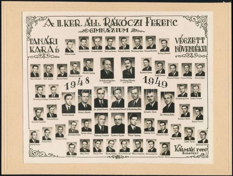 1949 Budapest, a II. ker., Állami Rákóczi Ferenc Gimnázium tanári kara és végzett növendékei, kistabló nevesített portrékkal, Kálmán fotó műterméből, 16,8x20,8 cm, karton 19x25 cm