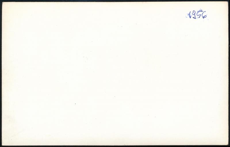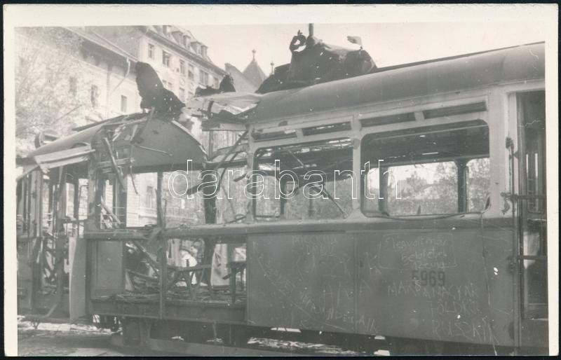 1956 Budapest, a forradalomban szétlőtt villamos, oldalán feliratok: "Elég volt már belőletek 12 évig!", "Mars a magyar földről ruszkik!", "Ruszkik haza!", fotó, 14×9 cm