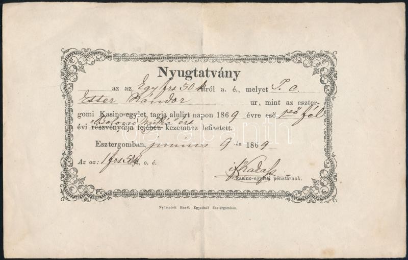 Beschreibung: 1869 Az Esztergomi Kaszinó Egylet nyomtatványa Etter Nándor (1839-1893) részére hírlap-előfizetés befizetéséről