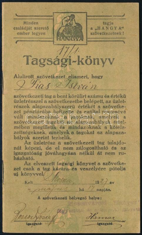 1927 A Hangya Szövetkezet tagsági könyve, Moson városi tag részére kiá... https://www.darabanth.com/de/366-Fernauktion/366.0/Kunst-Dokumente-andere-Sammelgebiete/Dokument~500017/1927-A-Hangya-Szovetkezet-tagsagi-konyve-Moson-varosi-tag-reszere-kiallitva-szep-allapot~II2120822