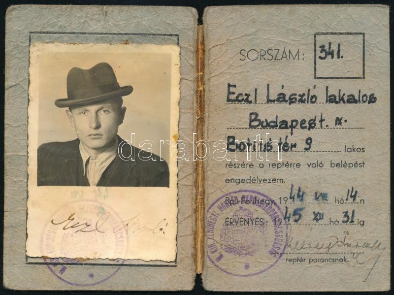 1944 Arcképes kitöltött belépési igazolvány lakatos részére a Magyar k... https://www.darabanth.com/de/366-Fernauktion/366.0/Kunst-Dokumente-andere-Sammelgebiete/Dokument~500017/1944-Arckepes-kitoltott-belepesi-igazolvany-lakatos-reszere-a-Magyar-kiralyi-ferihegyi-honv~II2121631