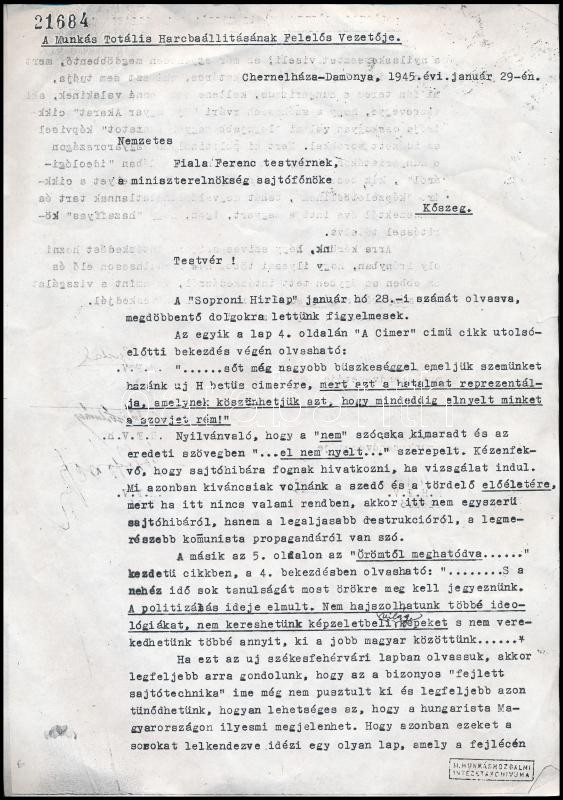 1945 Chernelházadamonya, A Munkás Totális Harcbaállításának Felelős Ve... https://www.darabanth.com/de/366-Fernauktion/366.0/Kunst-Dokumente-andere-Sammelgebiete/Dokument~500017/1945-Chernelhazadamonya-A-Munkas-Totalis-Harcbaallitasanak-Felelos-Vezetoje-altal-kuldo~II2122014