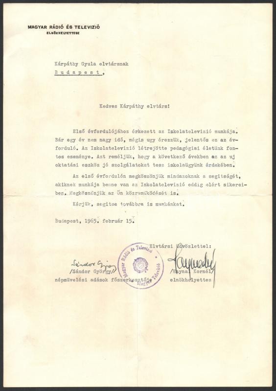 1965 Sándor György (1938-) humorista, előadóművész, népművelési adások főszerkesztője, és Haynal Kornél a Magyar Televízió elnökhelyettesének gépelt levele Kárpáthy Gyula (1922-2005) író részére, melyben az Iskolatelevízió eddigi sikereihez gratulálnak, a Magyar Rádió és Televízió elnökhelyettesének fejléces papírján, sajátkezű aláírásaikkal.