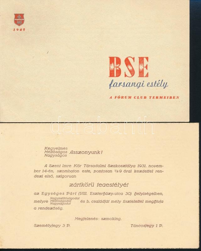 1926-1948 Meghívók különböző bálokra, estélyekre, 33 db (Meinl-kör, Műegyetemi Evezős Club, Széchényi-bál, Urbana-álarcosbál, Szent Imre Collégium, Medikus-bál, Jogász-bál, Budapest-bál...stb)