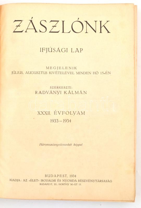 Beschreibung: 1933-1934 Zászlónk. XXXII. évf. 1-10 sz. Szerk.: Radványi Kálmán. Bp., "Élet." Félvászon-kötésben.
