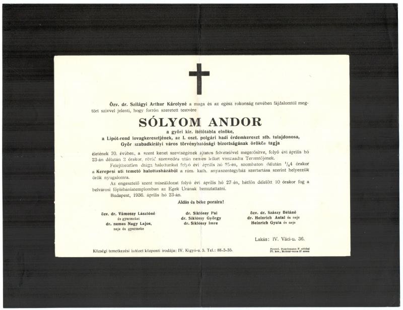 Beschreibung: 1936 Bp., Sólyom Andor a győri kir ítélőtábla elnökének, Győr szab. kir. város törvényhatósági bizottságának örökös tagjának halálozási értesítője.