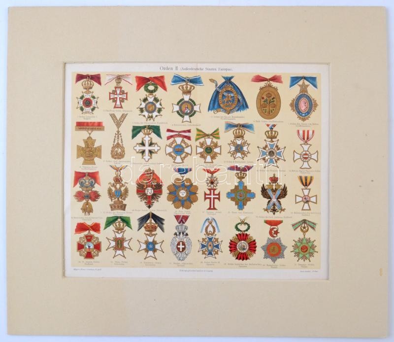 "Orden II - Außerdeutsche Staaten Europas" oldal a Meyers lexikonból, az európai, nem német államok kitüntetéseinek litográf ábráival, német nyelven, paszpartuban