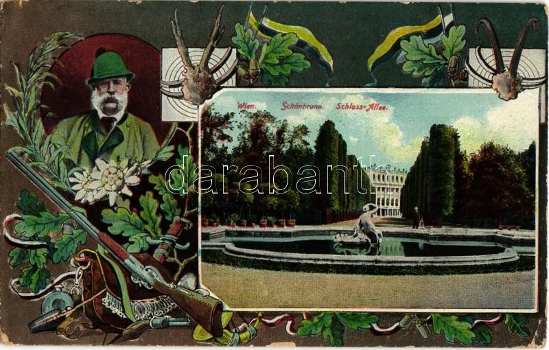 Vienna, Wien; Schönbrunn Schloss Allee / castle park. Franz Joseph wit... https://www.darabanth.com/de/367-Fernauktion/367.0/Ansichtskarten/Osterreich~1000058/Vienna-Wien-Schonbrunn-Schloss-Allee-castle-park-Franz-Joseph-with-hunting-equipment-Art-Nouv~II1947181