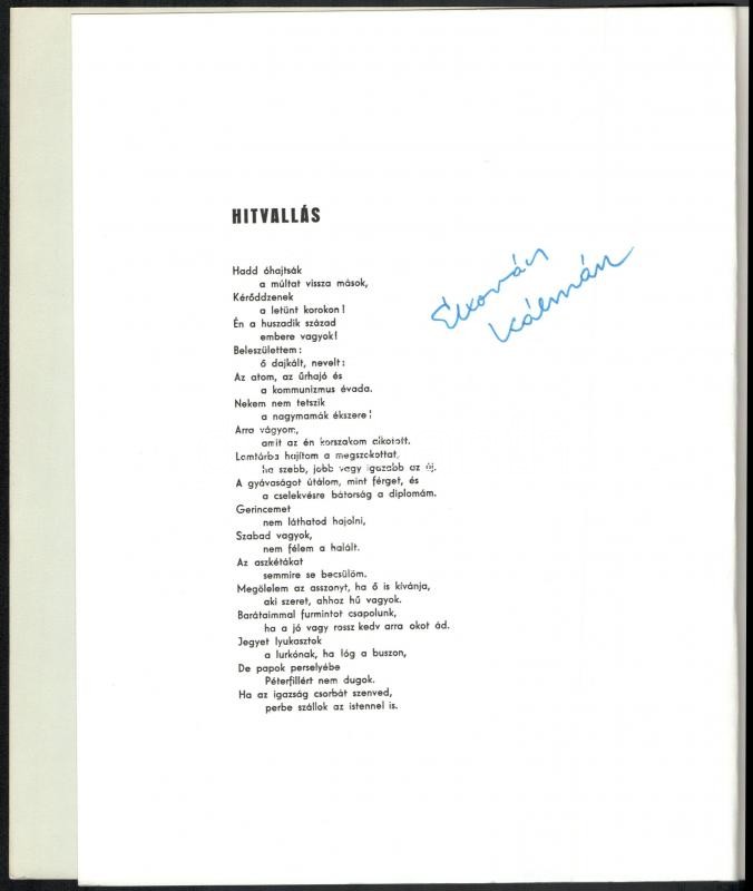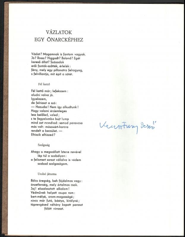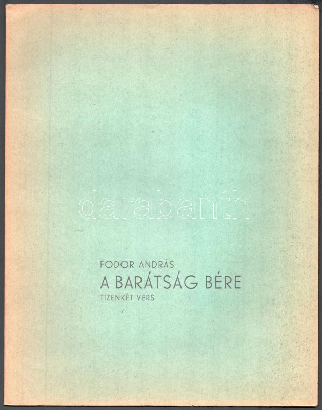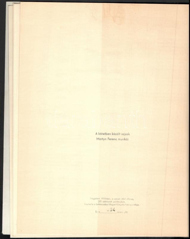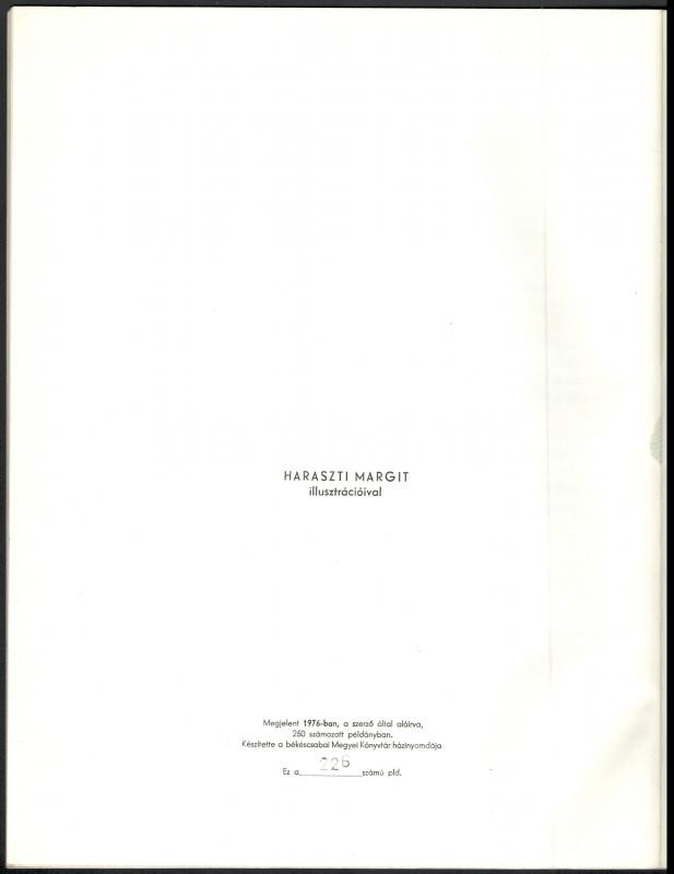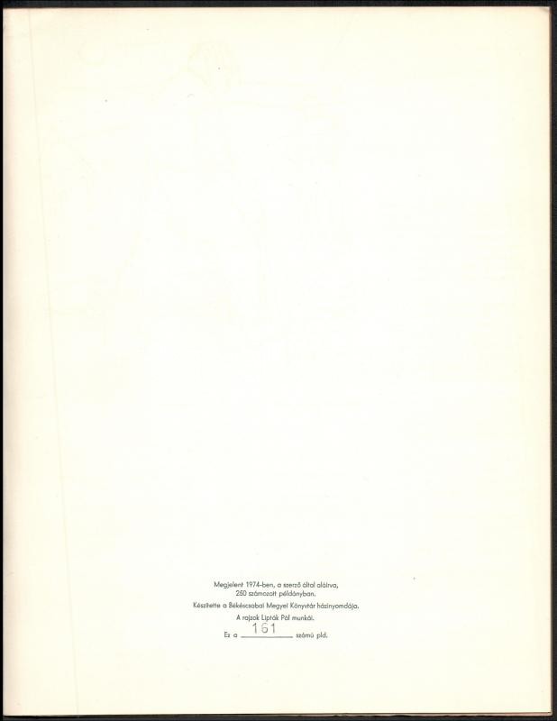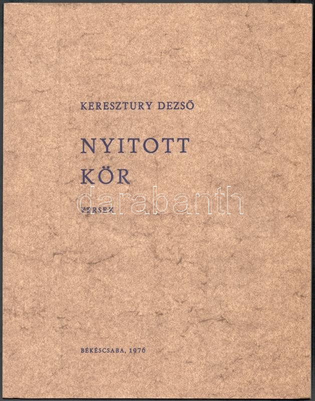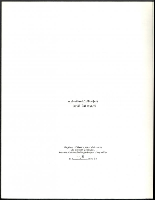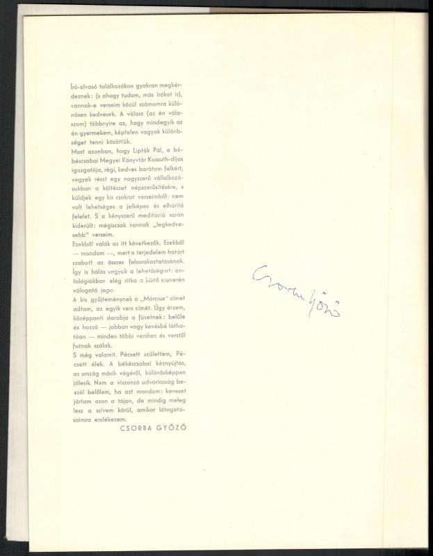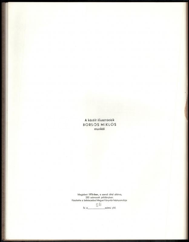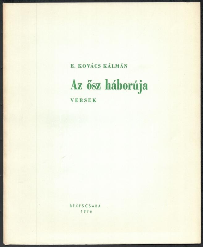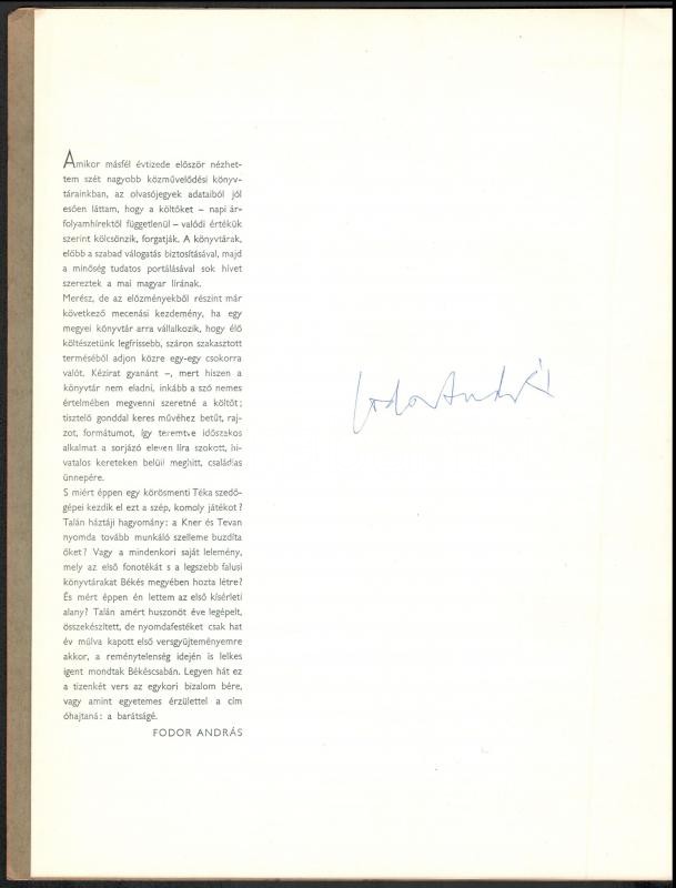 5 db Békéscsabai Megyei Könyvtár által kiadott bibliofil verseskötet sorozatából, mind számozott és aláírt példányok: Keresztury Dezső: Nyitott kör. Versek. Békéscsaba, 1976. Megyei Könyvtár. "A közölt illusztrációk Borsos Miklós munkái". Számozott példány (250/88.) A szerző, Keresztury Dezső (1904-1996) által aláírt! Jó állapotban. + Kovács Kálmán, E.: Az ősz háborúja. Versek. Békéscsaba, 1976. Megyei Könyvtár. A rajzok Lipták Pál munkái. Számozott példány (250/186.) A szerző által aláírt! Jó állapotban. + Ladányi Mihály: Föld! Föld! Huszonegy vers. Békéscsaba, 1976, Megyei Könyvtár. Haraszti Margit illusztrációival. Számozott (226/250), Ladányi Mihály (1934-186) által aláírt példány! Jó állapotban. + Csorba Győző: Március. Tizenhárom vers. Békéscsaba, 1975. Megyei Könyvtár. A rajzok Martyn Ferenc munkái. Számozott (250/94.), a szerző Csorba Győző (1916-1995) által aláírt példány! Enyhén kopott, hátoldalán foltos borítóval. + Fodor András: A barátság bére. Tizenkét vers. Békéscsaba, 1974. Megyei Könyvtár. Lipták Pál rajzaival. Számozott (250/161.), a szerző Fodor András (1929-1997) által aláírt példány! Enyhén kopott, elszínezödőtt borítóval Az összes példány kiadói kartonálásban, Fodor András kötet kivételével kiadói papír védőborítóval.