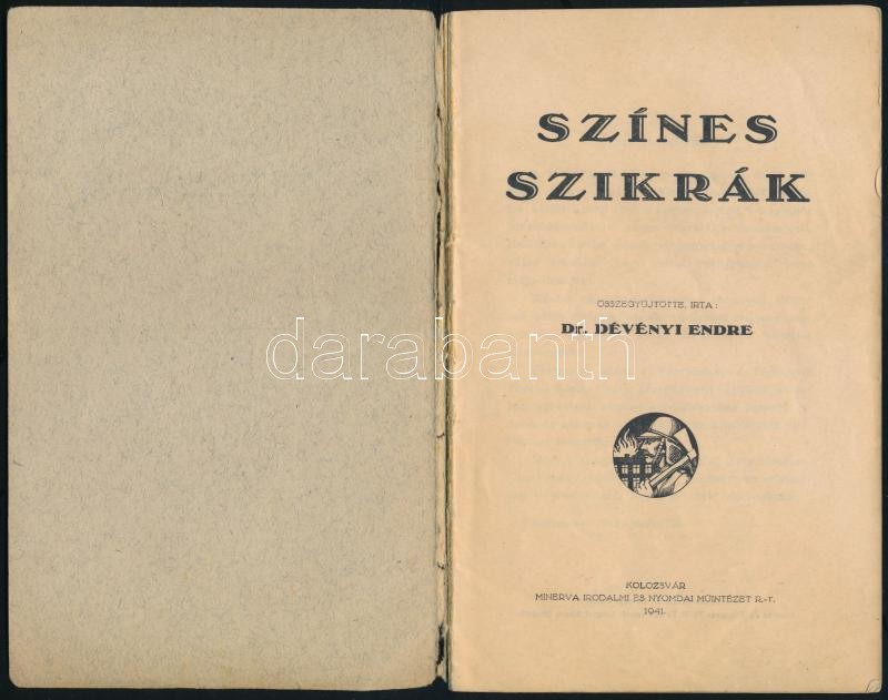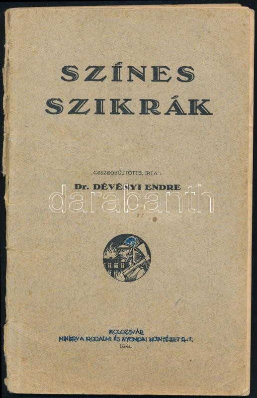 Dr. Dévényi Endre: Színes szikrák. Összegyűjtötte, írta: - -. Kolozsvár, 1941., Minerva, 52 p. Tűzoltósággal kapcsolatos vers, és anekdota gyűjtemény. Kiadói papírkötés, a könyvtest elvált a borítótól, a fűzése laza.