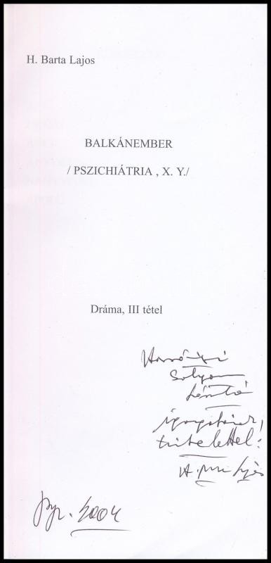 H. Barta Lajos: Balkánember. (Pszichiátria, X. Y.) Dráma, III. tétel. ... https://www.darabanth.com/de/367-Fernauktion/367.0/Bucher/Bucher-Andere-kuriositaten~1500019/H-Barta-Lajos-Balkanember-Pszichiatria-X-Y-Drama-III-tetel-Bp-2003-Szerzoi-Ki~II2102995
