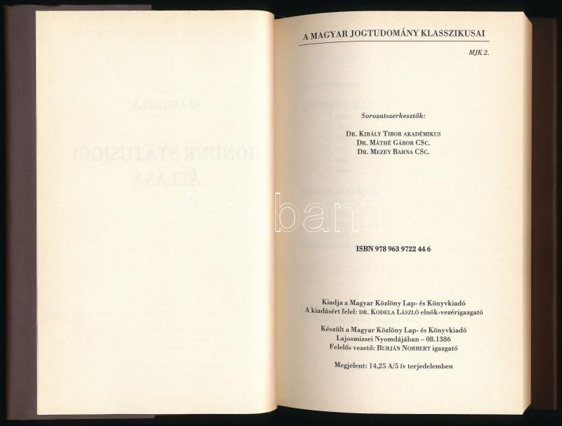 Szabó Béla: A Magyar Korona országainak státusjogi és monarchiai állása a Pragmatica Sanctio szerint. 1848, Író sajátja. REPRINT! H.n., Magyar Közlöny Lap- és Könyvkiadó. Kiadói kartonált kötés, papír védőborítóval, jó állapotban.