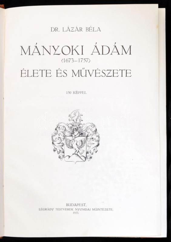 Dr. Lázár Béla: Mányoki Ádám (1673-1757) élete és művészete. Bp.,1933,Légrády,1 t.+144 p.+14 t.+2 melléklet.+LXXVI t. Fekete-fehér képtáblákkal, és 2 hasonmással illusztrált. Első kiadás. Átkötött félvászon-kötés, kissé kopott borítóval.