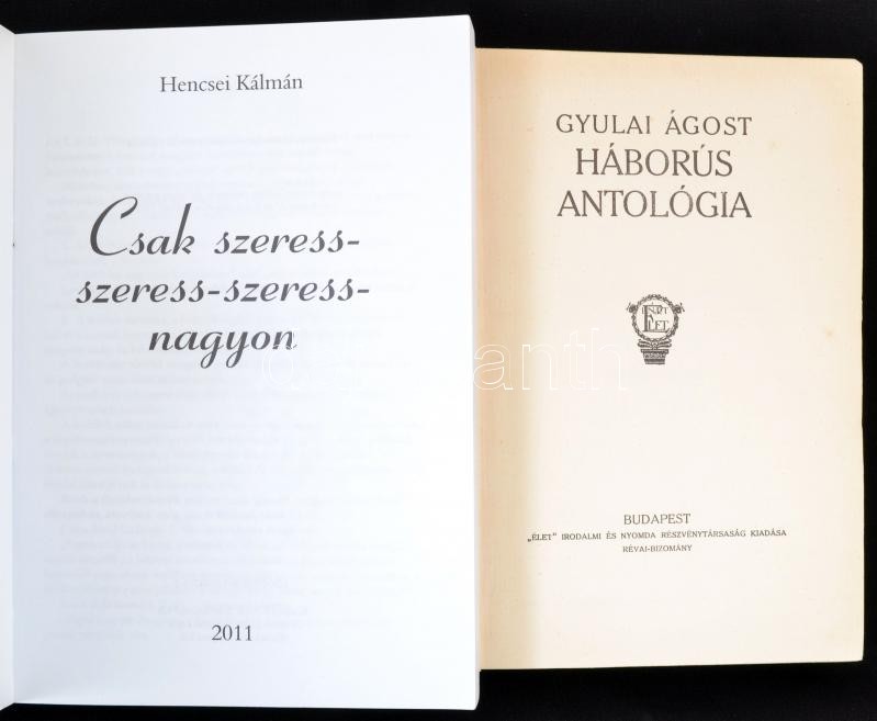 2 db könyv - Gyulai Ágost: Háborús Antológia. Bp., Élet. Kiadói egészvászon kötés, kissé kopottas állapotban + Hencsei Kálmán: Csak szeress-szeress-szeress nagyon. H.n., 2011. Kiadói papírkötés, jó állapotban.