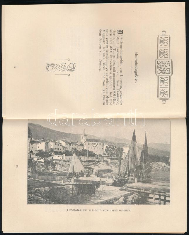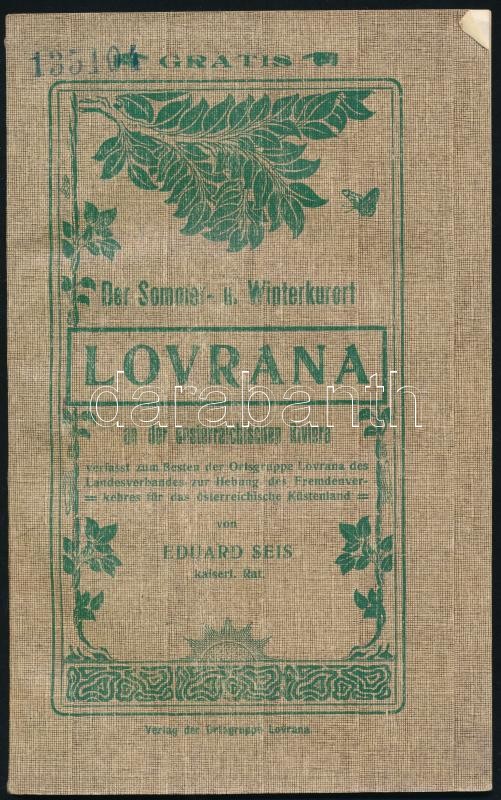 cca 1900-1910 Eduard Seis: Der Sommer- und Winterkurort Lovrana an der oesterreichischen Riviera. hn.,én., Verlag der Ortsgruppe Lovrana,(Fiume, Emidio Mohovich-ny.), 63 p. Német nyelven. Fekete-fehér fotókkal. Kiadói papírkötésben.
