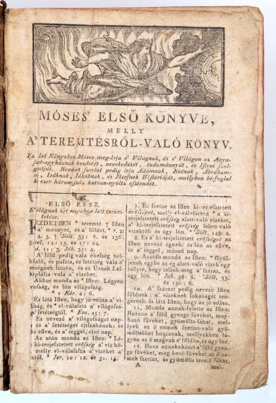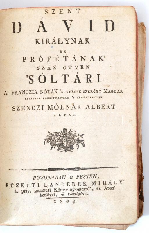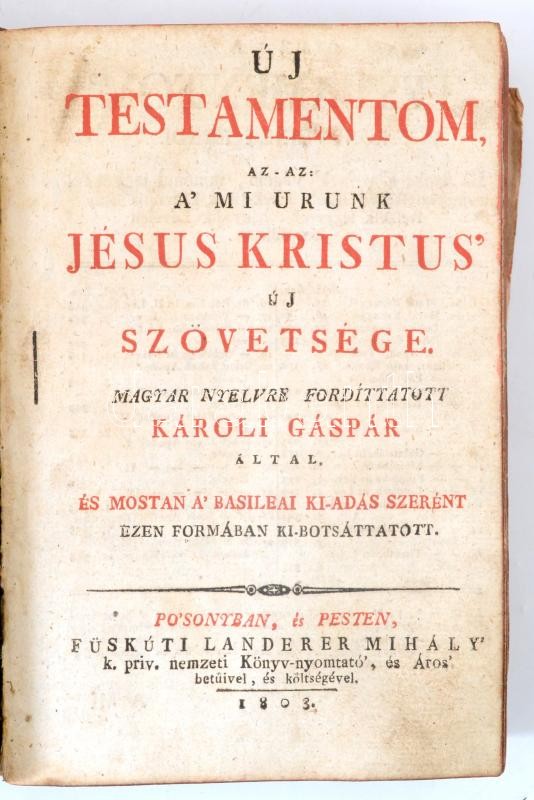 Szent Biblia, az-az Istennek ó és új testamentomában foglaltatott egész Szent Írás. Magyar nyelvre fordíttatott Károli Gáspár által és mostan a' basileai ki-adás szerint ezen formában ki-botsáttatott.; hozzákötve: Szent Dávid királynak és prófétának száz ötven 'sóltári a franczia nóták 's versek szerént magyar versekre fordíttattak 's rendeltettek Szenczi Molnár Albert által. Po'sonyban és Pesten, 1803., Patzkó Ferenc József, 4+1 t.+2+1152+392+122+4 p. Sérült egészbőr kötésben, az első 8 lap hiányzik.