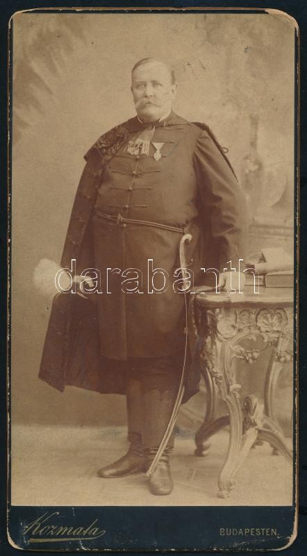 Beschreibung: cca 1900 Díszmagyaros tisztviselő, szablyás portréfotója, kitüntetéssel, keményhátú fotó, Bp., Kozmata, kopásnyomokkal, 20x11 cm