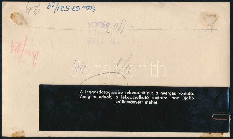 Beschreibung: cca 1960 Szovjet nyerges vontató teherautó, a hátoldalán felirattal, pecséttel, 13x22 cm