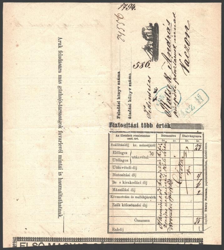 Beschreibung: 1869 A Első Magyar Gőzhajózási Társaság Honvéd hajó fuvarlevele szakadással / Bill of fright of Middle-Danube Steamship Company ship Honvéd.