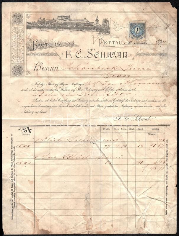 Beschreibung: 1884 Pettau, Factura von F.C. Schwab gyár német nyelvű, fejléces számlája, esztergomi lakos részére, foltos, 1 Kr. osztrák okmánybélyeggel.