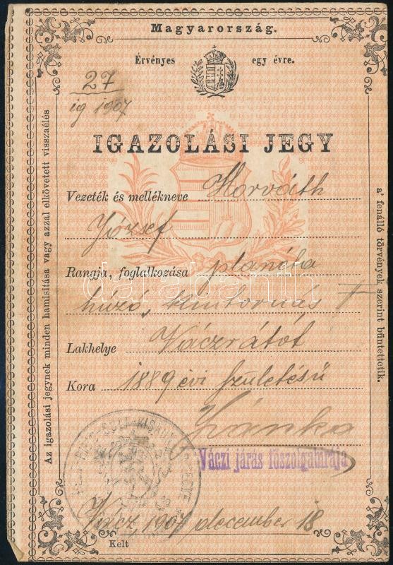Beschreibung: 1907 Planétahúzó és kintornás részére szolgáló igazolási jegy
