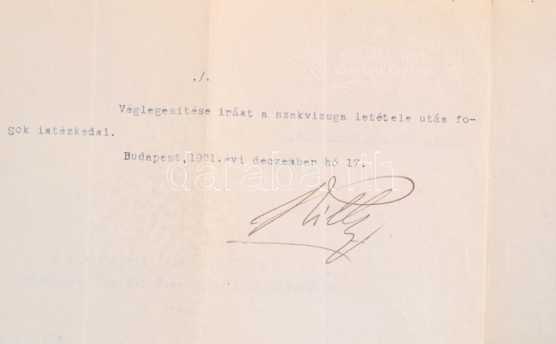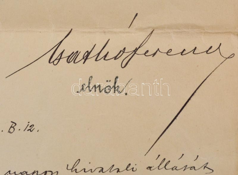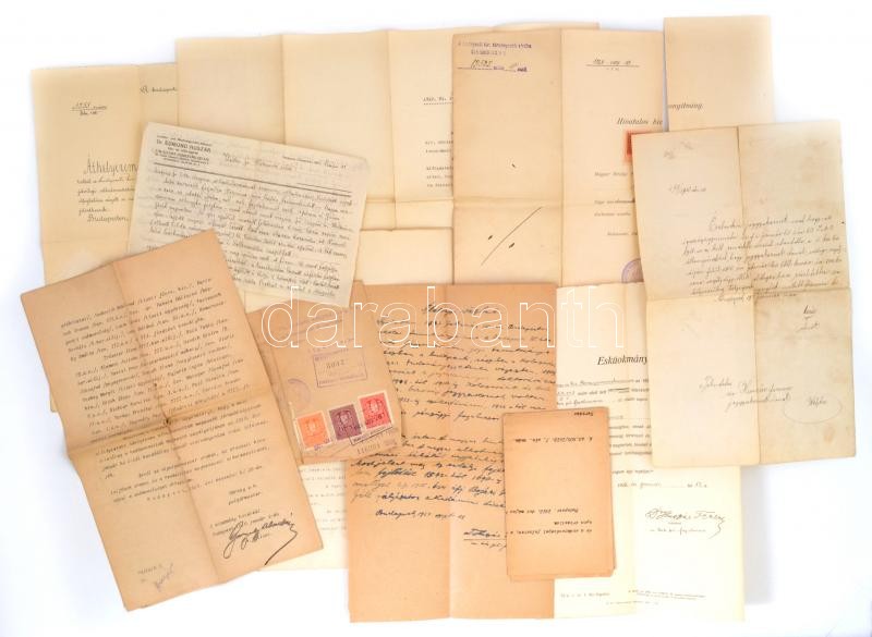 1909-1931 Huszár Ferenc jogász, hivatalnok irathagyatéka, kinevezések, áthelyezések, eskü okmány, életrajzi vázlat, Budapest Székesfőváros Polgármesteri hivatal rendelete...stb, 11 db. Közte egy kinevezéssel, rajta Nagykállói Kállay Tibor (1881-1964) pénzügyminiszter aláírásával, a M. Kir. Pénzügyminisztérium fejléces papírján. Valamint egy lemondást elfogadó nyilatkozat, rajta Balogi Baloghy György(1861-1931) Budapesti Büntető Törvényszék elnökének, későbbi igazságügyminiszternek az aláírásával. Továbbá áthelyezési értesítés, a Budapesti Kir. Büntető Törvényszékhez, rajta csíkdelnei Csathó Ferenc (1845-1928) valóságos belső titkos tanácsos, a budapesti királyi ítélőtábla elnökének aláírásával (Csathó Kálmán (1881-1964) író édesapja.) Továbbá hivatalos bizonyítvánnyal a Kolozsvári Kir. Ferenc József Tudományegyetemről, rajta: Udránszky Lászlónak (1862-1914) rektor aláírásával (szétszakadt.) Változó állapotban.