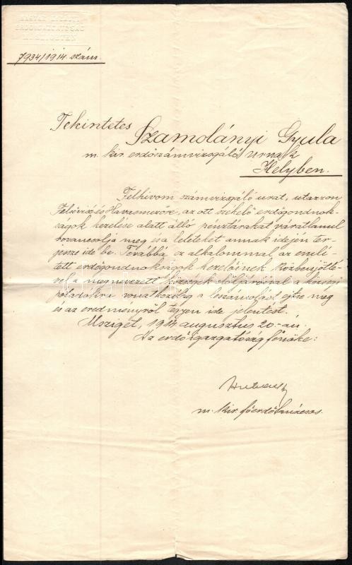 1914 Szamolányi Gyula m. kir. erdőszámvizsgálórészére szóló részére szóló levél, amelyben felszólítják, hogy utazzon Felsővisóra(Viseu de Sus) és Havasmezőre (ma Ruszpolyána/ Poienile de sub Munte, korábban Ruspoiana), Máramarossziget, M. Kir. Erdőigazgatóság, Hubay Zsigmond m. kir. főerdőtanácsos aláírásával, fejléces papíron, 1914. aug. 20.