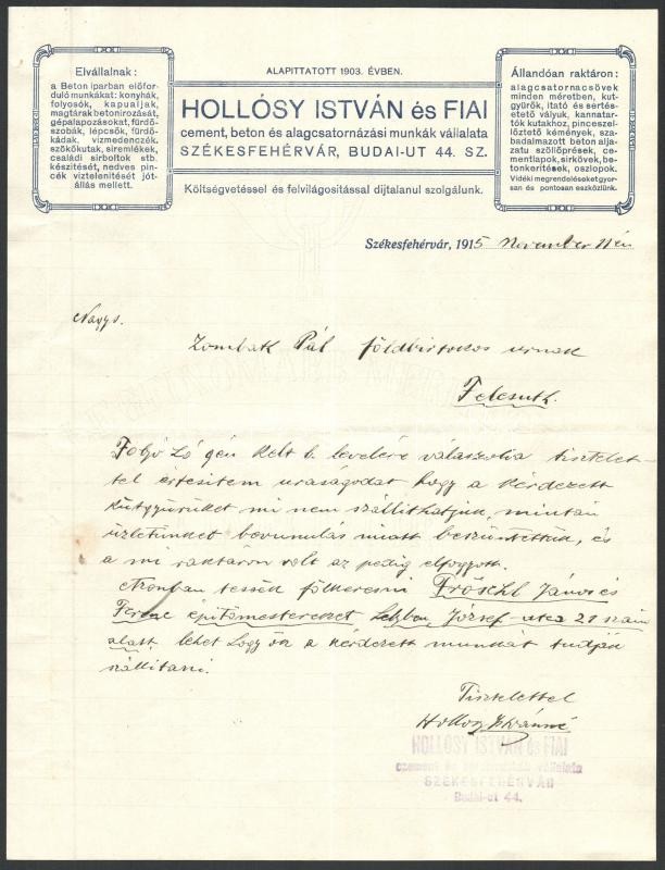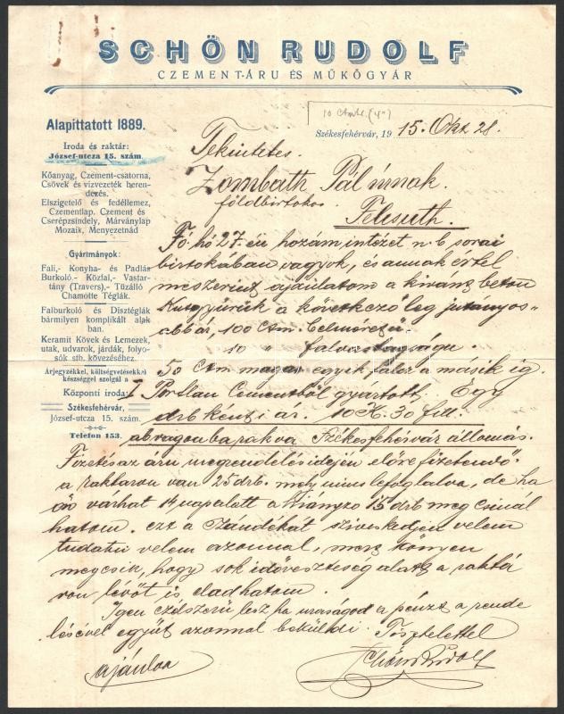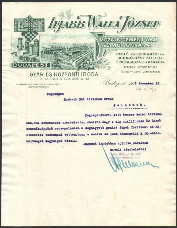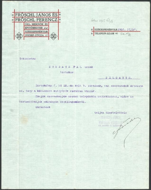 1915 Felcsút, kútgyűrűk ügyében íródott levél és számla gyűjtemény, 8 db. Közte: Bp., Ifj. Walla József Mozaik- Cementárú és Műkőgyárának 5 db levele,a cég fejléces papírján, 1915. nov. 11.,15.,18., dec 6., 13.; Székesfehérvár, Fröschl János és Fröschl Ferenc okl. mérnök és építőmester levele, fejléces papíron, 1915. nov. 17.; Székesfehérvár, Hollósy István és Fiai Cement, Beton és Alagcsatornázási Munkák Vállalatának levele, fejléces papíron, 1915. nov. 11.; Székesfehérvár, Schön Rudolf Cementárú és Műkőgyárának levele, fejléces papíron, 1915. okt. 28.