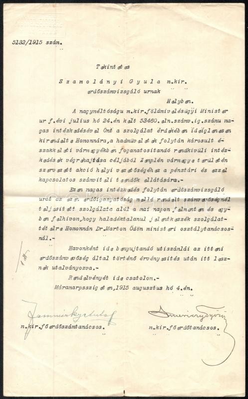 1915 Szamolányi Gyula m. kir. erdőszámvizsgáló áthelyezési papírja Máramarosszigetről Homonnára, a károsult északkeleti vármegyékben foganatosítandó rendkívüli intézkedések végrehajtási céljából,Máramarossziget, M. Kir. Erdőigazgatóság fejléces papírján, aláírásokkal.