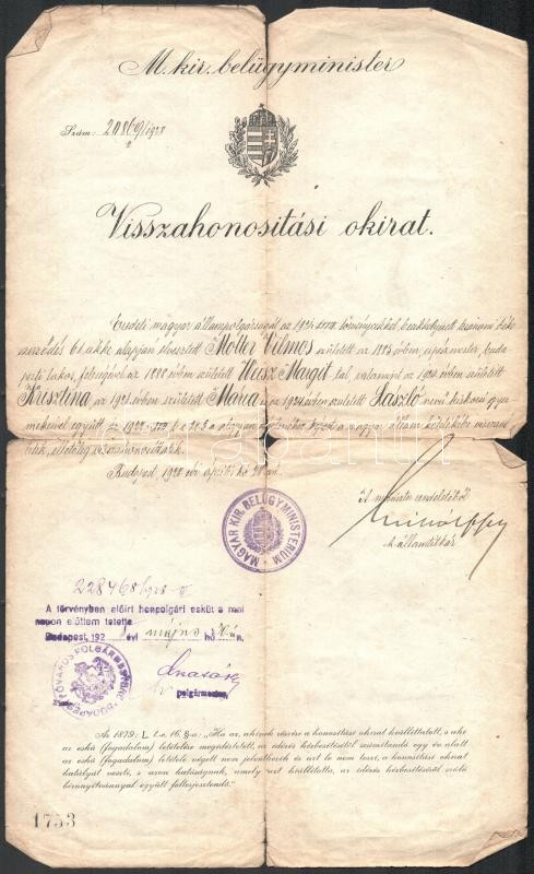 Beschreibung: 1928 Bp., M. kir. belügyminiszter által kiadott visszahonosítási okirat