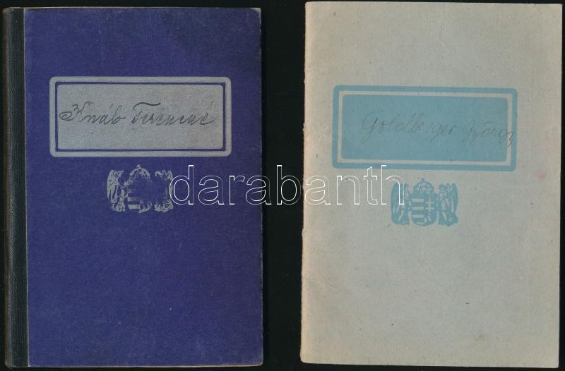 1937-1944 Gyári munkás munkakönyve, benne M. Kir. Budapesti Nemzeti és Szabadkikötő, M. Kir. Hadianyaggyár Lőszerüzem, Weiss Manfréd gyár bebélyegzésekkel.+1945-46 Női szabó segéd munkakönyve, másolat