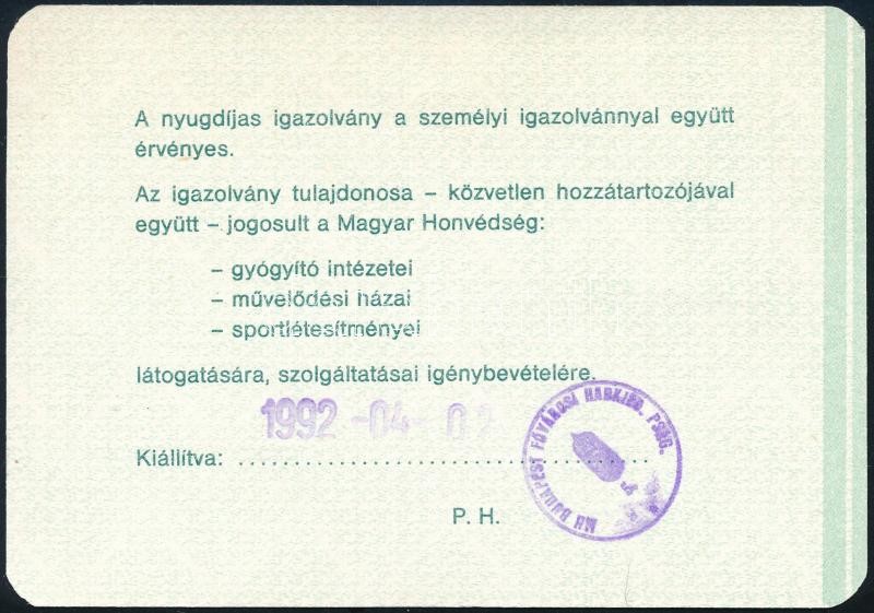 1992 Honvédségi fényképes nyugdíjas igazolvány alezredes részére https://www.darabanth.com/de/367-Fernauktion/367.0/Kunst-Dokumente-andere-Sammelgebiete/Dokument~18/1992-Honvedsegi-fenykepes-nyugdijas-igazolvany-alezredes-reszere~II2125800