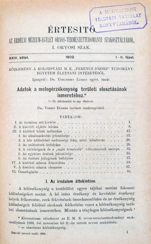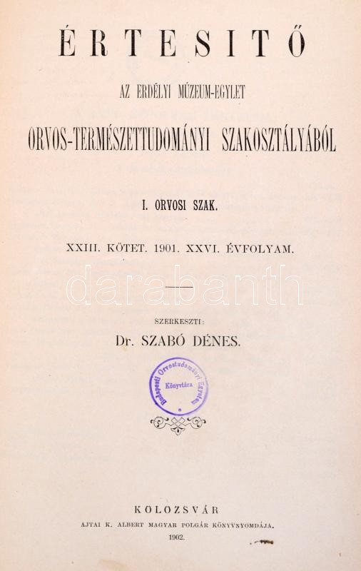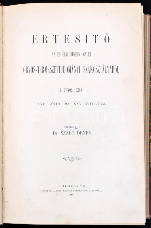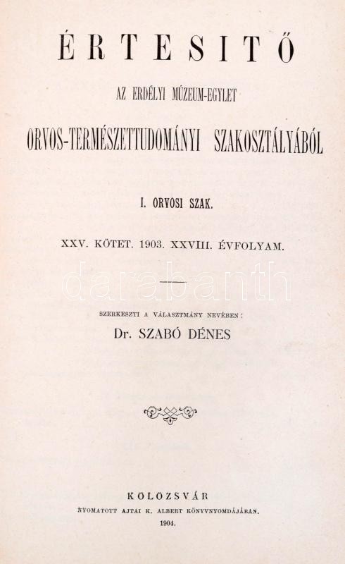 1901-1903 Értesítő az Erdélyi Múzeum-Egylet Orvos-Természettudományi Szakosztályából. I. Orvosi szak. XXII. köt. XXV. évfolyam. III. füzet, XXIII. köt. XXVI. évf. III. füzet, XXIV. köt. XXVII. évf. I-II. füzet, XXV. köt. XXVIII. évf. I-III. füzet. Csak a XXV. kötet teljes. 1900-1903. Szerk.: Szabó Dénes. Kolozsvár,1901-1904, Lajtai K. Albert, 4+155-226; 4+49-68;4+171-268;+41-70;2+264;60 p.+VI t.+4+191+60+193-368 p.+ 1 t.+61-80 p. Kopott félvászon-kötésben, intézményi bélyegzővel.